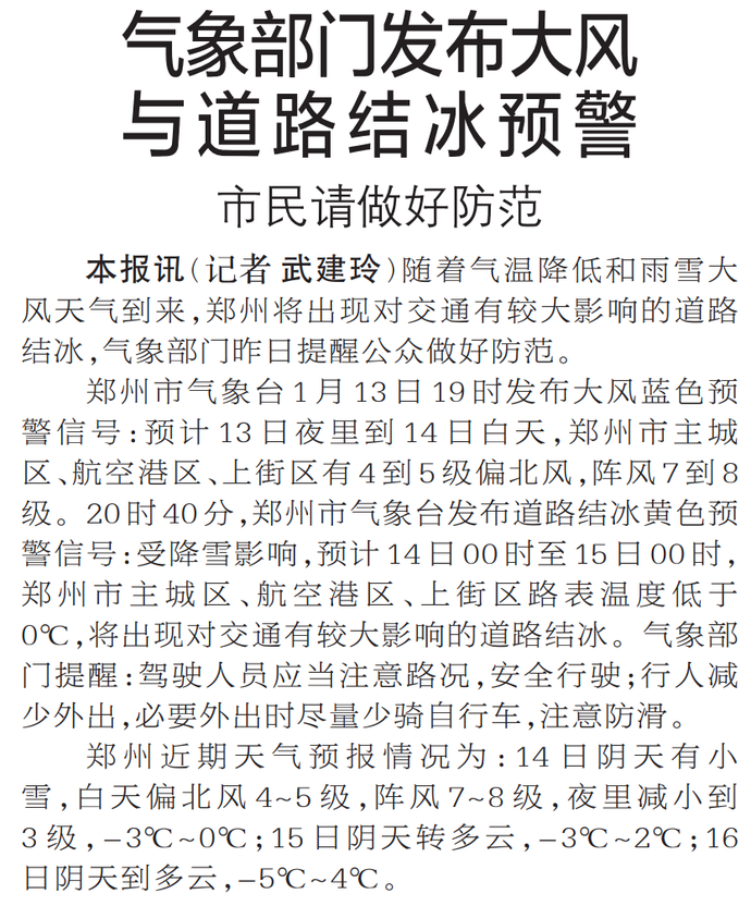 随着气温降低和雨雪大风天气到来,郑州将出现对交通有较大影响的道路结冰,气象部门昨日提醒公众做好防范。(今日《郑州日报》2版)