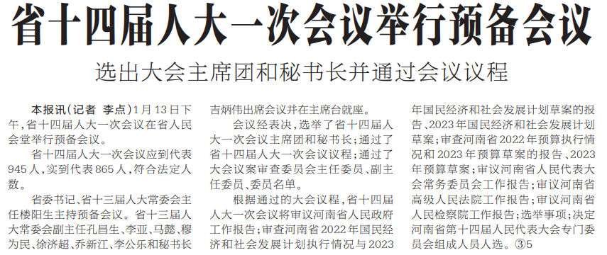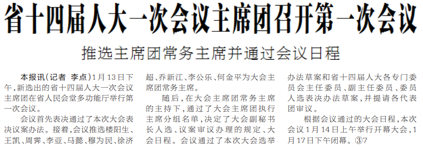 1月13日下午,省十四届人大一次会议在省人民会堂举行预备会议。