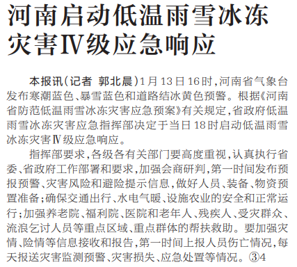 1月13日16时,河南省气象台发布寒潮蓝色、暴雪蓝色和道路结冰黄色预警。根据《河南省防范低温雨雪冰冻灾害应急预案》有关规定,省政府低温雨雪冰冻灾害应急指挥部决定于当日18时启动低温雨雪冰冻灾害Ⅳ级应急响应。(今日《河南日报》5版)
