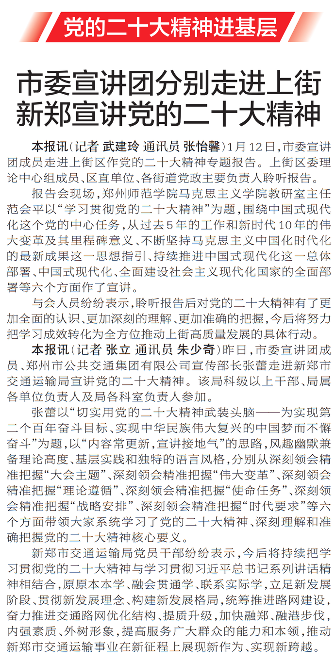 1月12日,市委宣讲团成员走进上街区作党的二十大精神专题报告。上街区委理论中心组成员、区直单位、各街道党政主要负责人聆听报告。(今日《郑州日报》2版)