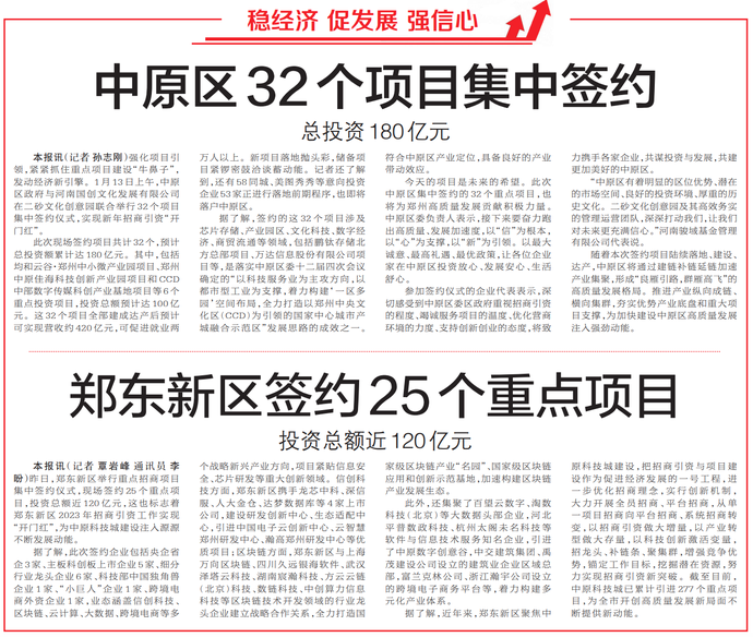 昨日,郑东新区举行重点招商项目集中签约仪式,现场签约25个重点项目,投资总额近120亿元,这也标志着郑东新区2023年招商引资工作实现“开门红”,为中原科技城建设注入源源不断发展动能。(今日《郑州日报》5版)