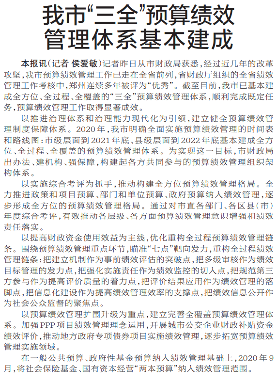 记者昨日从市财政局获悉,经过近几年的改革攻坚,我市预算绩效管理工作已走在全省前列,省财政厅组织的全省绩效管理工作考核中,郑州连续多年被评为“优秀”。截至目前,我市已基本建成全方位、全过程、全覆盖的“三全”预算绩效管理体系,顺利完成既定任务,预算绩效管理工作取得显著成效。(今日《郑州日报》5版)