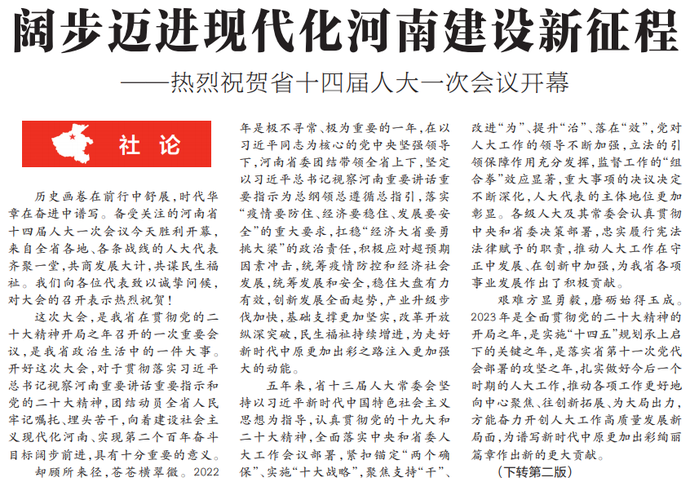 历史画卷在前行中舒展,时代华章在奋进中谱写。备受关注的河南省十四届人大一次会议今天胜利开幕,来自全省各地、各条战线的人大代表齐聚一堂,共商发展大计,共谋民生福祉。我们向各位代表致以诚挚问候,对大会的召开表示热烈祝贺!(今日《河南日报》1版)