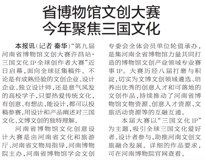 “第九届河南省博物馆文创大赛许昌站·三国文化IP全球创作者大赛”近日启幕,面向全球征集稿件。不论是有成熟经验的文创企业、设计企业、独立设计师,还是意气风发的高校学子,只要热爱传统文化,有创意、有想法、能设计,都可以投稿参赛,用设计和产品阐述对三国文化、文博文创的独特理解。(今日《郑州日报》2版)
