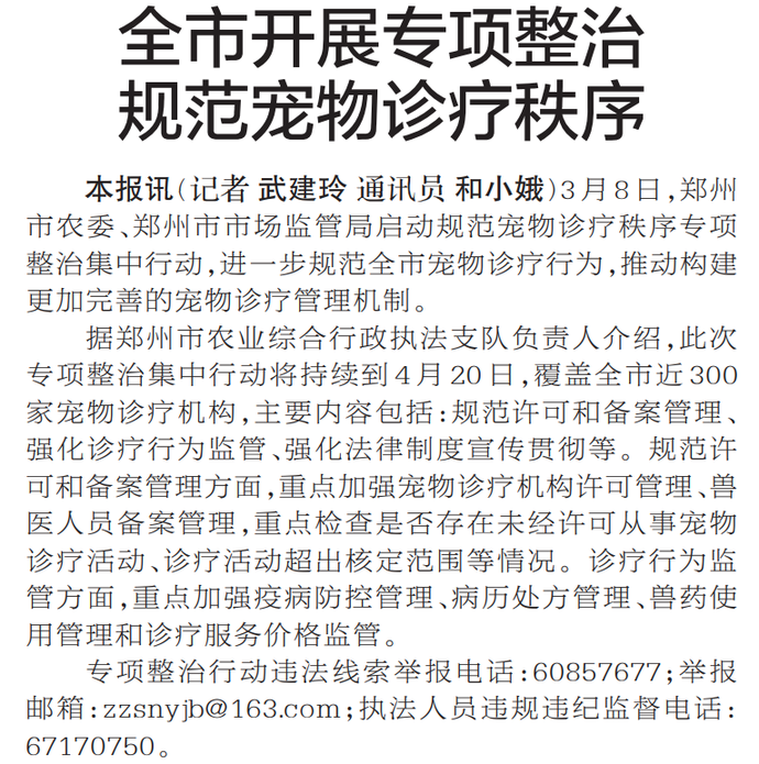 3月8日,郑州市农委、郑州市市场监管局启动规范宠物诊疗秩序专项整治集中行动,进一步规范全市宠物诊疗行为,推动构建更加完善的宠物诊疗管理机制。(今日《郑州日报》2版)
