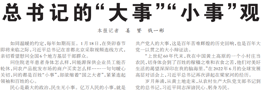 问住院老年患者身体怎么样,问能源保供企业员工能否轮休,问农产品批发市场的商户买卖怎么样……一句句暖心关切,问的都是百姓“小事”,却浓缩着“国之大者”,紧紧连起领袖和百姓的心。