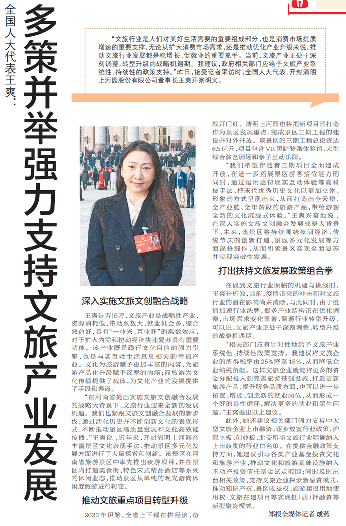 “文旅行业是人们对美好生活需要的重要组成部分,也是消费市场提质增速的重要支撑,无论从扩大消费市场需求,还是推动优化产业升级来说,推动文旅行业发展都是稳增长、促就业的重要抓手。当前,文旅产业正处于深刻调整、转型升级的战略机遇期。我建议,政府相关部门应给予文旅产业系统性、持续性的政策支持。”昨日,接受记者采访时,全国人大代表、开封清明上河园股份有限公司董事长王爽开宗明义。(今日《郑州日报》6版)