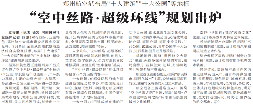 对标国际,凸显特色,郑州航空大都市建设将再次拉高标杆。3月8日,记者从郑州航空港经济综合实验区获悉,布局“十大建筑”“十大公园”等地标的“空中丝路·超级环线”建设规划已经出炉。(今日《河南日报》5版)