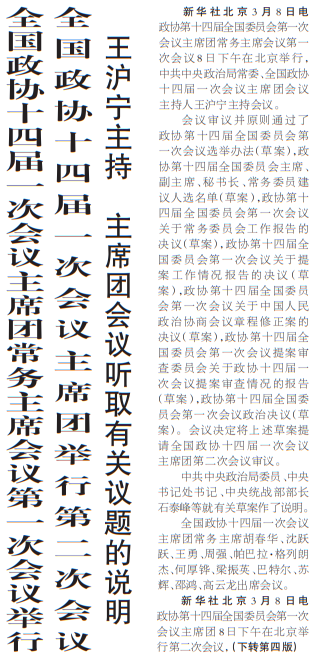 政协第十四届全国委员会第一次会议主席团常务主席会议第一次会议8日下午在北京举行,中共中央政治局常委、全国政协十四届一次会议主席团会议主持人王沪宁主持会议。(今日《人民日报》1版、4版)
