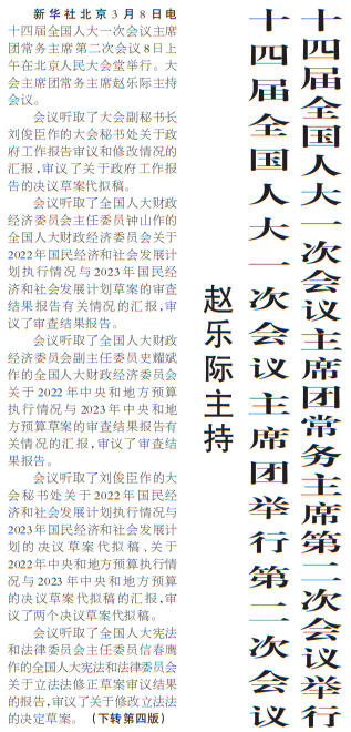 十四届全国人大一次会议主席团常务主席第二次会议8日上午在北京人民大会堂举行。大会主席团常务主席赵乐际主持会议。(今日《人民日报》1版、4版)