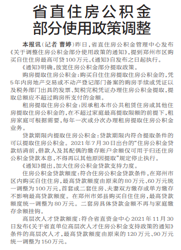 昨日,省直住房公积金管理中心发布《关于调整住房公积金部分使用政策的通知》,提到郑州市区购买自住住房最高可贷100万元。《通知》自发布之日起执行。(今日《郑州日报》1版)