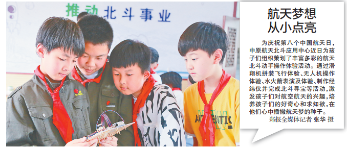 为庆祝第八个中国航天日,中原航天北斗应用中心近日为孩子们组织策划了丰富多彩的航天北斗动手操作体验活动。通过滑翔机拼装飞行体验、无人机操作体验、水火箭表演及体验、制作经纬仪并完成北斗寻宝等活动,激发孩子们对航空航天的兴趣,培养孩子们的好奇心和求知欲,在他们心中播撒航天梦的种子。(今日《郑州日报》1版)