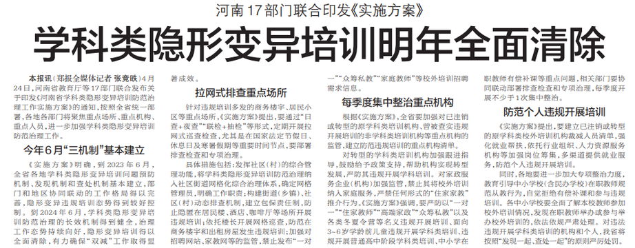 4月24日,河南省教育厅等17部门联合发布关于印发《河南省学科类隐形变异培训防范治理工作实施方案》的通知,按照全省统一部署,各地各部门将聚焦重点场所、重点机构、重点人员,进一步加强学科类隐形变异培训防范治理工作。(今日《郑州日报》2版)