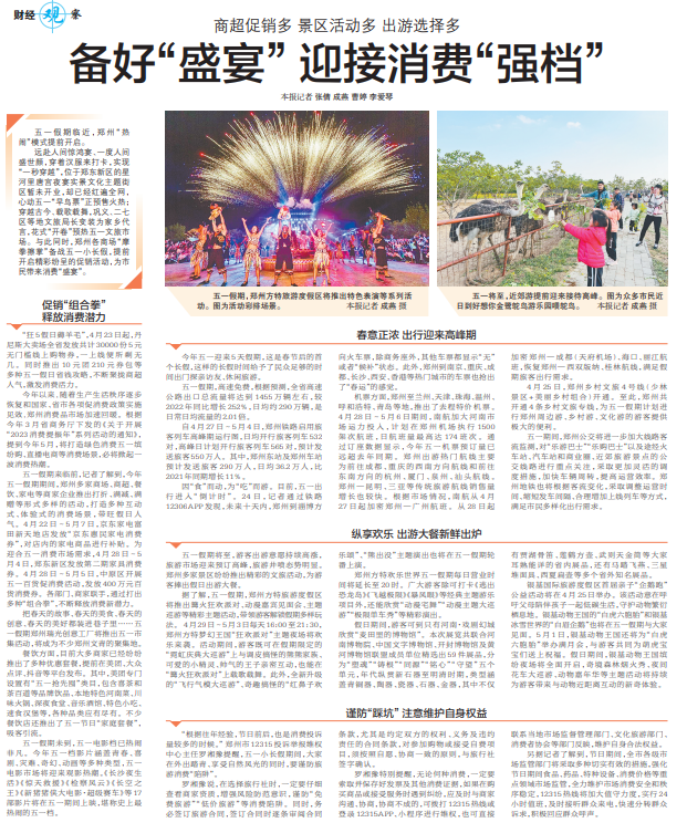 远赴人间惊鸿宴、一度人间盛世颜,穿着汉服来打卡,实现“一秒穿越”,位于郑东新区的星河里唐宫夜宴实景文化主题街区暂未开业,却已经红遍全网,心动五一“早鸟票”正预售火热;穿越古今、载歌载舞,巩义、二七区等地文旅局长变装为家乡代言,花式“开卷”预热五一文旅市场。与此同时,郑州各商场“摩拳擦掌”备战五一小长假,提前开启精彩纷呈的促销活动,为市民带来消费“盛宴”。(今日《郑州日报》5版)