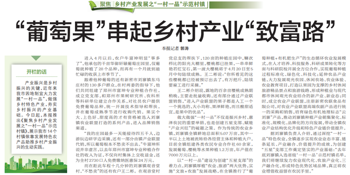 产业振兴是乡村振兴的关键,近年来我市因地制宜大力发展“一村一品”,做强乡村特色产业,夯实乡村振兴的产业基础。今日起,本报推出《聚焦乡村产业发展之“一村一品”示范村镇》,展示我市14个村镇依靠发展特色农产品助推乡村产业振兴的生动实践。