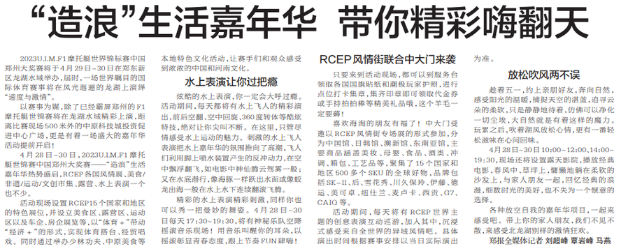 2023U.I.M.F1摩托艇世界锦标赛中国郑州大奖赛将于4月29日~30日在郑东新区龙湖水域举办,届时,一场世界瞩目的国际体育赛事将在风光迤逦的龙湖上演绎“速度与激情”。(今日《郑州日报》8版)