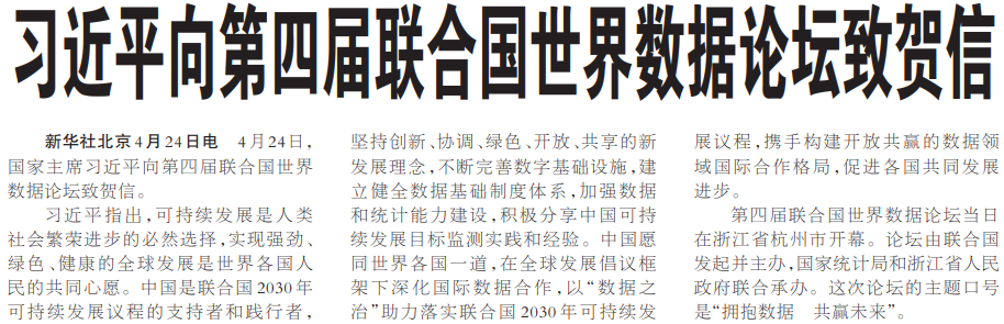 4月24日,国家主席习近平向第四届联合国世界数据论坛致贺信。(今日《人民日报》1版)