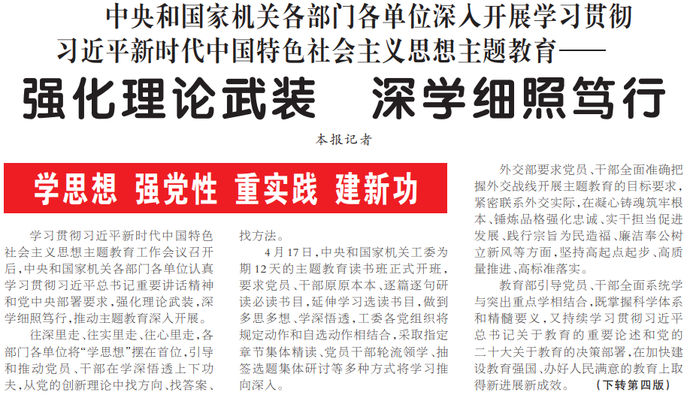 学习贯彻习近平新时代中国特色社会主义思想主题教育工作会议召开后,中央和国家机关各部门各单位认真学习贯彻习近平总书记重要讲话精神和党中央部署要求,强化理论武装,深学细照笃行,推动主题教育深入开展。(今日《人民日报》1版、4版)