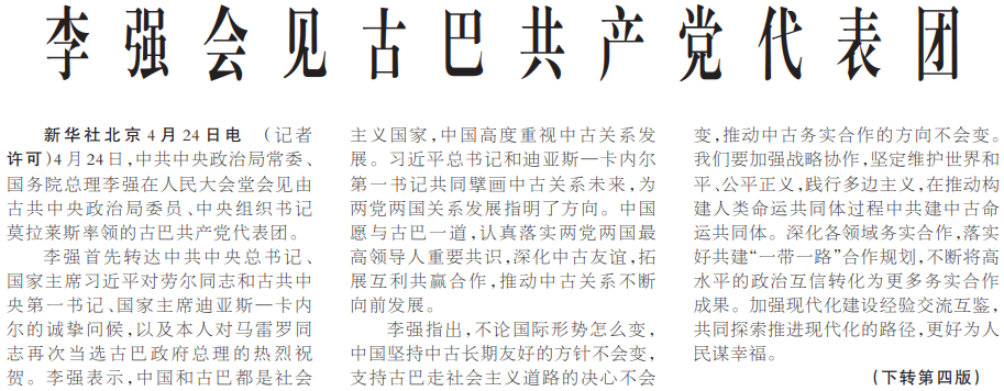 4月24日,中共中央政治局常委、国务院总理李强在人民大会堂会见由古共中央政治局委员、中央组织书记莫拉莱斯率领的古巴共产党代表团。(今日《人民日报》1版、4版)