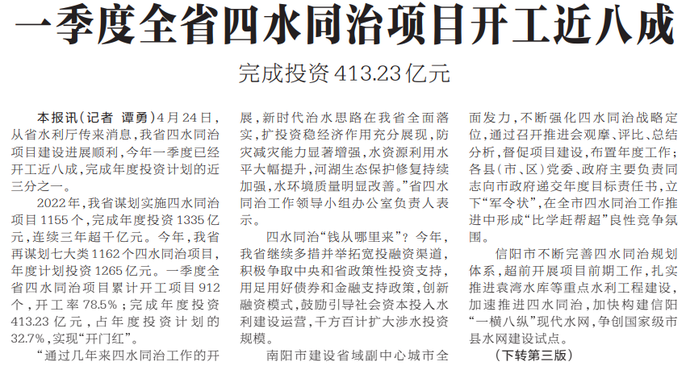 4月24日,从省水利厅传来消息,我省四水同治项目建设进展顺利,今年一季度已经开工近八成,完成年度投资计划的近三分之一。(今日《河南日报》1版、3版)