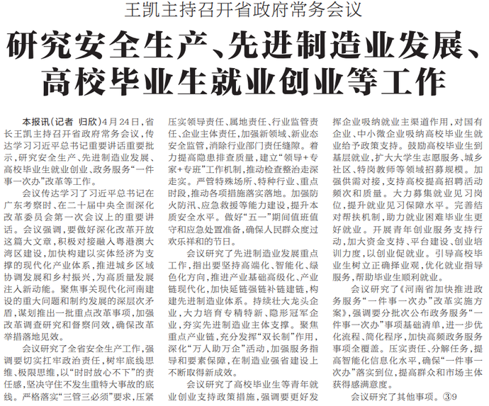 4月24日,省长王凯主持召开省政府常务会议,传达学习习近平总书记重要讲话重要批示,研究安全生产、先进制造业发展、高校毕业生就业创业、政务服务“一件事一次办”改革等工作。(今日《河南日报》1版)