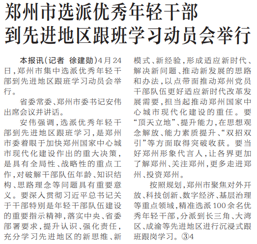 4月24日,郑州市集中选派优秀年轻干部到先进地区跟班学习动员会举行。