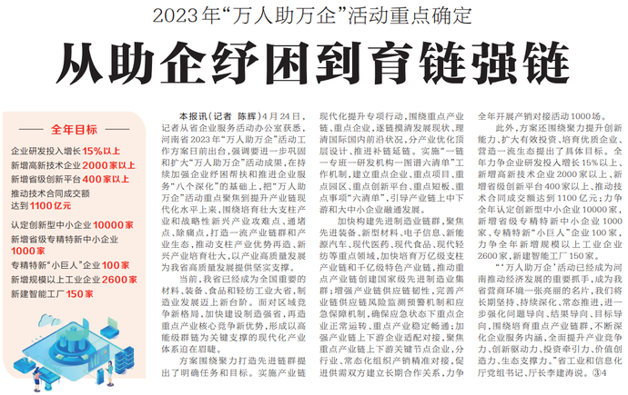 4月24日,记者从省企业服务活动办公室获悉,河南省2023年“万人助万企”活动工作方案日前出台,强调要进一步巩固和扩大“万人助万企”活动成果,在持续加强企业纾困帮扶和推进企业服务“八个深化”的基础上,把“万人助万企”活动重点聚焦到提升产业链现代化水平上来,围绕培育壮大支柱产业和战略性新兴产业攻难点、通堵点、除痛点,打造一流产业链群和产业生态,推动支柱产业优势再造、新兴产业培育壮大,以产业高质量发展为我省高质量发展提供坚实支撑。(今日《河南日报》2版)