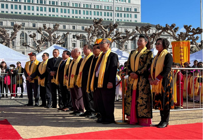 大典现场彩旗飘扬、古风盎然,巨幅黄帝帷幕在旧金山市政府前显得格外庄严伟岸,令人肃然起敬。参与敬拜的嘉宾们都佩戴着黄帝丝巾,以崇敬之礼虔诚敬拜,共同祈愿和平和睦和谐,共建海外华夏儿女精神家园,为实现中华民族伟大复兴中国梦凝聚力量。