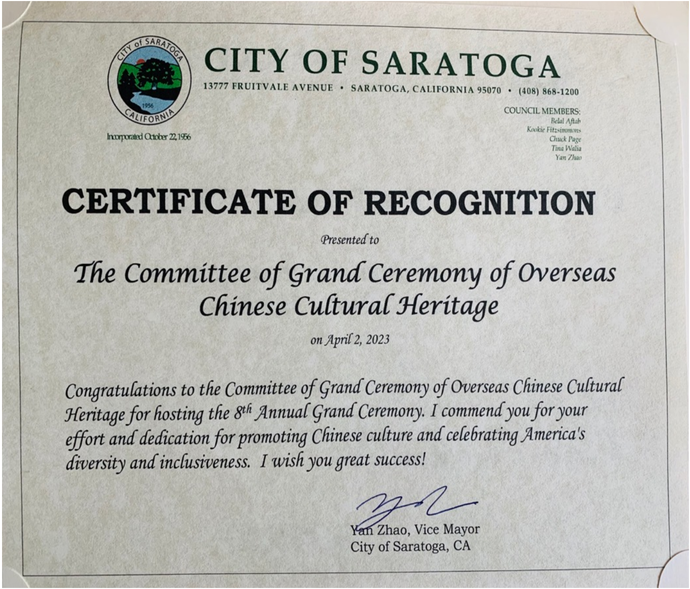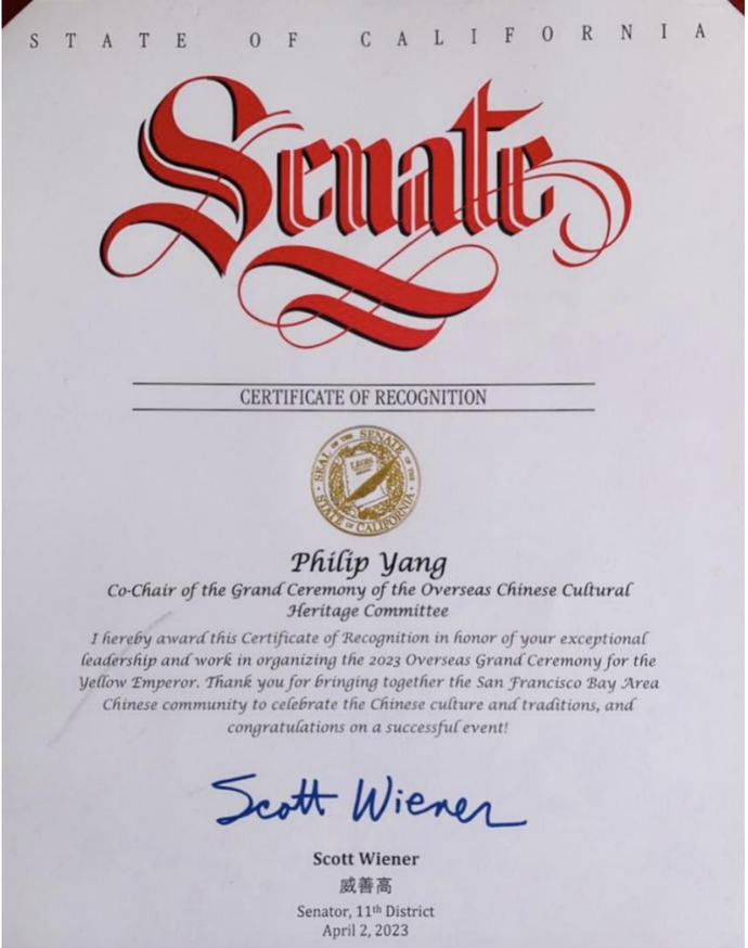 加州参议员威善高向组委会执行主席杨磊发来的贺状