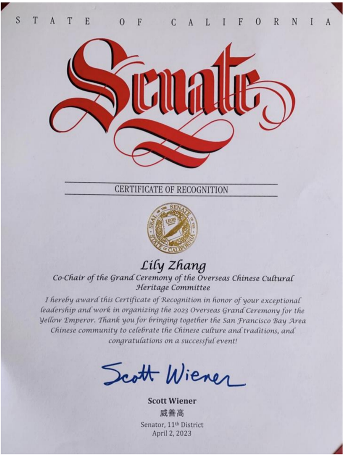 加州参议员威善高向组委会主席张丽莉发来的贺状