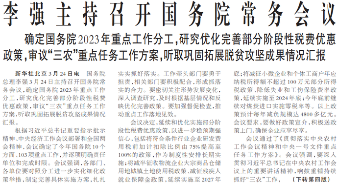 国务院总理李强3月24日主持召开国务院常务会议,确定国务院2023年重点工作分工,研究优化完善部分阶段性税费优惠政策,审议“三农”重点任务工作方案,听取巩固拓展脱贫攻坚成果情况汇报。(今日《人民日报》1版、4版)