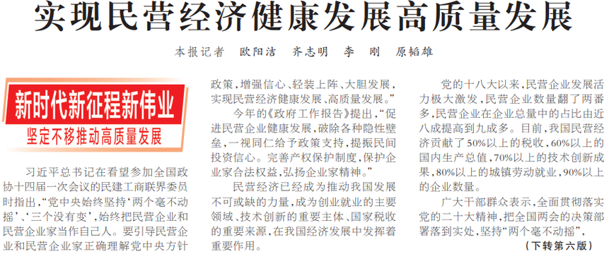 习近平总书记在看望参加全国政协十四届一次会议的民建工商联界委员时指出,“党中央始终坚持‘两个毫不动摇’、‘三个没有变’,始终把民营企业和民营企业家当作自己人。要引导民营企业和民营企业家正确理解党中央方针政策,增强信心、轻装上阵、大胆发展,实现民营经济健康发展、高质量发展。”