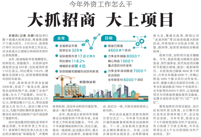谋划举行数十场重大招商活动、筹备推进数千个重大项目。3月23日,省商务厅举行2023年全省外资工作会议,对全省更大力度吸引和利用外资作出系统部署。(今日《河南日报》2版)
