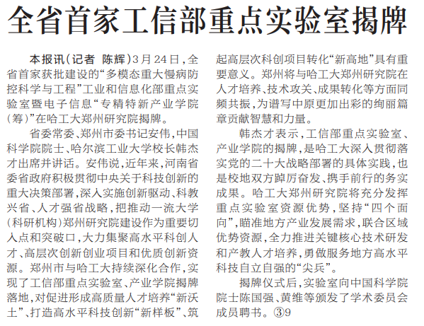 3月24日,全省首家获批建设的“多模态重大慢病防控科学与工程”工业和信息化部重点实验室暨电子信息“专精特新产业学院(筹)”在哈工大郑州研究院揭牌。