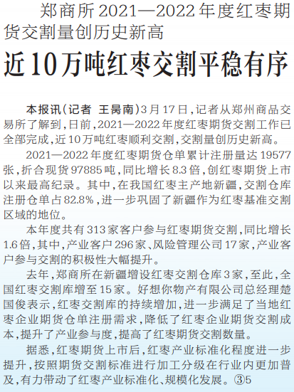 3月17日,记者从郑州商品交易所了解到,日前,2021—2022年度红枣期货交割工作已全部完成,近10万吨红枣顺利交割,交割量创历史新高。(今日《河南日报》4版)