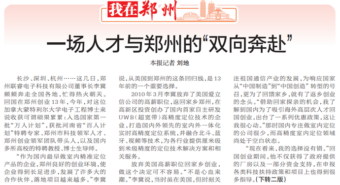 长沙、深圳、杭州……这几日,郑州联睿电子科技有限公司董事长李冀频频奔走全国各地,忙得热火朝天。回国在郑州创业13年,今年,对这位加拿大蒙特利尔大学电子工程博士来说收获可谓硕果累累:入选国家第一批“万人计划”,获批河南省“百人计划”特聘专家、郑州市科技领军人才、郑州创业领军团队带头人,以及国内多所高校的特聘教授、博士生导师。(今日《郑州日报》1版、2版)