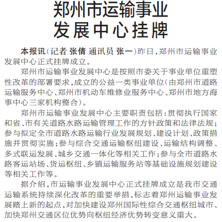 昨日,郑州市运输事业发展中心正式挂牌成立。(今日《郑州日报》2版)
