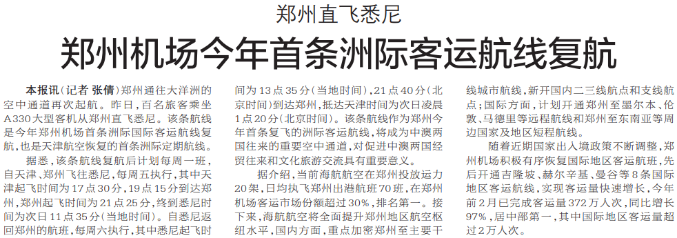 郑州至悉尼洲际客运航线正式复航