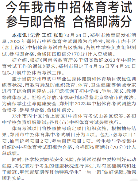 3月24日,郑州市教育局发布消息,2023年郑州市中招体育考试调整为合格考,郑州市内十区(含上街区)中招体育考试由各区统筹,各初中学校负责组织测试,参与即合格,合格即按照满分(70分)计入总成绩。(今日《郑州日报》3版)
