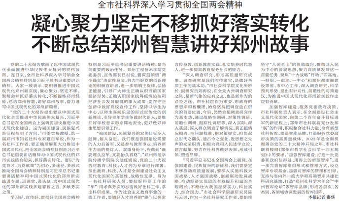 党的二十大报告擘画了以中国式现代化全面推进中华民族伟大复兴的宏伟蓝图。连日来,全市社科界深入学习领会全国两会精神特别是习近平总书记重要讲话精神。大家一致表示,要积极推进中国式现代化郑州新实践,凝心聚力、坚定不移、聚精会神抓好落实转化,不断提炼郑州经验,总结郑州智慧,讲好郑州故事,奋力谱写中国式现代化的郑州新篇章。(今日《郑州日报》2版)