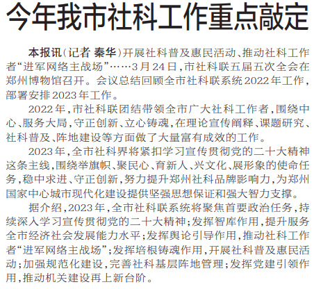 开展社科普及惠民活动、推动社科工作者“进军网络主战场”……3月24日,市社科联五届五次全会在郑州博物馆召开。会议总结回顾全市社科联系统2022年工作,部署安排2023年工作。(今日《郑州日报》3版)
