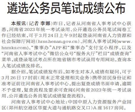 昨日,记者从河南省人事考试中心获悉,河南省2023年统一考试录用、公开遴选公务员笔试阅卷工作已经结束,可于3月24日上午9时起登录河南省人力资源和社会保障厅网站(hrss.henan.gov.cn)、河南人事考试网(www.hnrsks.com)、“豫事办”APP和“豫事办”支付宝小程序,以及“河南省人事考试中心”微信公众号“服务大厅”栏目“成绩查询”菜单,或登录笔试考点所在地省辖市考试录用专用网站,查询本人笔试成绩及排名。(今日《郑州日报》3版)