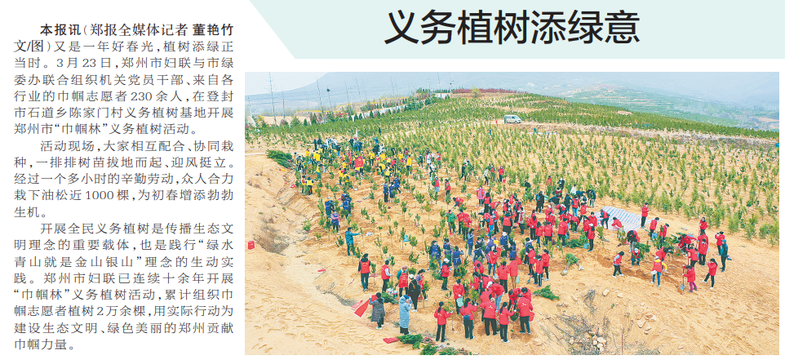 又是一年好春光,植树添绿正当时。3月23日,郑州市妇联与市绿委办联合组织机关党员干部、来自各行业的巾帼志愿者230余人,在登封市石道乡陈家门村义务植树基地开展郑州市“巾帼林”义务植树活动。(今日《郑州日报》2版)