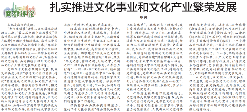“大河文明展”开展三天吸引观众近两万人次,“第五届全国中国画展览”创郑州单日观展人数纪录,舞剧天花板《水月洛神》全国巡演场场爆满,郑州三景区入选全国旅游产品创意案例库,“郑州文创”荣登国家级展销平台,黄帝故里拜祖大典接下来如约而至……丰富多彩的文化生活,琳琅满目的文化产品,百花齐放的文艺园地,共同描绘出郑州文化事业和文化产业繁荣发展的生动景象。(今日《郑州日报》3版)