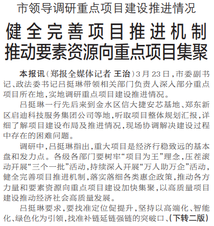 3月23日,市委副书记、政法委书记吕挺琳带领相关部门负责人深入部分重点项目所在地,实地调研重点项目建设推进情况。(今日《郑州日报》1版、2版)