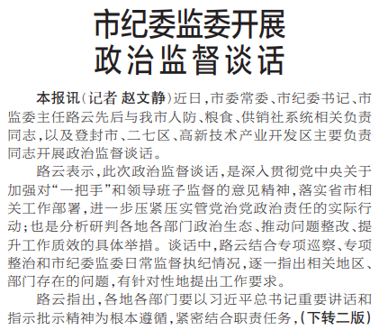 近日,市委常委、市纪委书记、市监委主任路云先后与我市人防、粮食、供销社系统相关负责同志,以及登封市、二七区、高新技术产业开发区主要负责同志开展政治监督谈话。(今日《郑州日报》1版、2版)