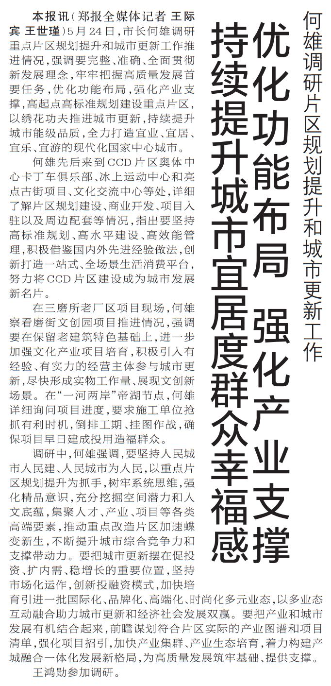 5月24日,市长何雄调研重点片区规划提升和城市更新工作推进情况,强调要完整、准确、全面贯彻新发展理念,牢牢把握高质量发展首要任务,优化功能布局,强化产业支撑,高起点高标准规划建设重点片区,以绣花功夫推进城市更新,持续提升城市能级品质,全力打造宜业、宜居、宜乐、宜游的现代化国家中心城市。(今日《郑州日报》1版)