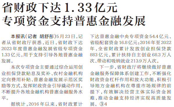 5月23日,记者从省财政厅获悉,近日,省财政下达2023年度普惠金融发展省级专项资金1.33亿元,用于支持引导各地普惠金融发展。(今日《河南日报》5版)