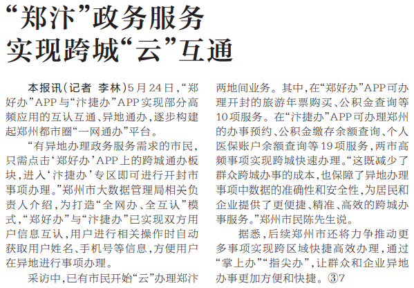 5月24日,“郑好办”APP与“汴捷办”APP实现部分高频应用的互认互通、异地通办,逐步构建起郑州都市圈“一网通办”平台。(今日《河南日报》5版)