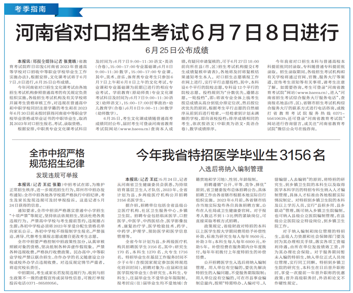省教育考试院昨日印发《河南省2023年普通高等学校对口招收中等职业学校毕业生工作实施办法》,根据安排,文化课考试将于6月7日、8日进行,6月25日公布成绩。(今日《郑州日报》2版)